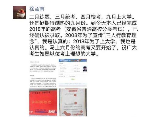 2018年5月3日,徐孟南在朋友圈晒出了自己的录取通知书,他被安徽一所大专院校的新闻采编与制作专业录取。